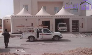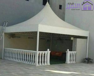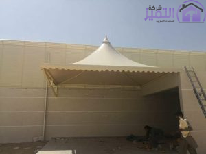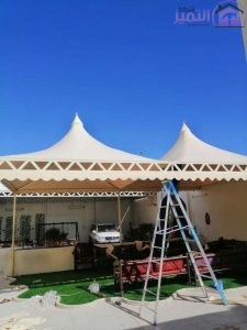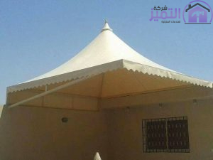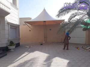 - بعد حفر المكان تثبت المظلة عمدانها أو قواعدها وتثبيت نوع القماش الذي تم اختياره.